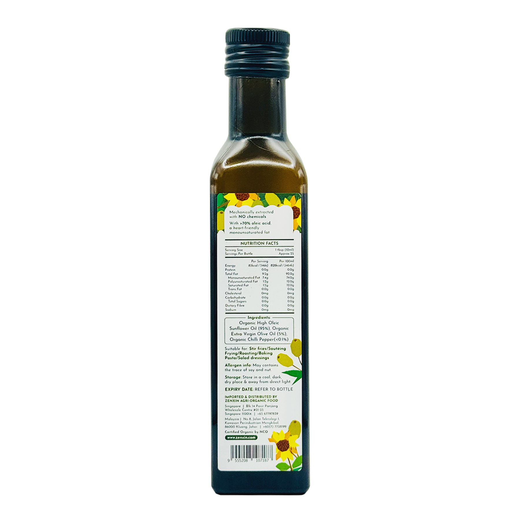 Organic High Oleic Sunflower Oil (95%), Organic Extra Virgin Olive Oil (5%), Organic Chilli Pepper(<0.1%)