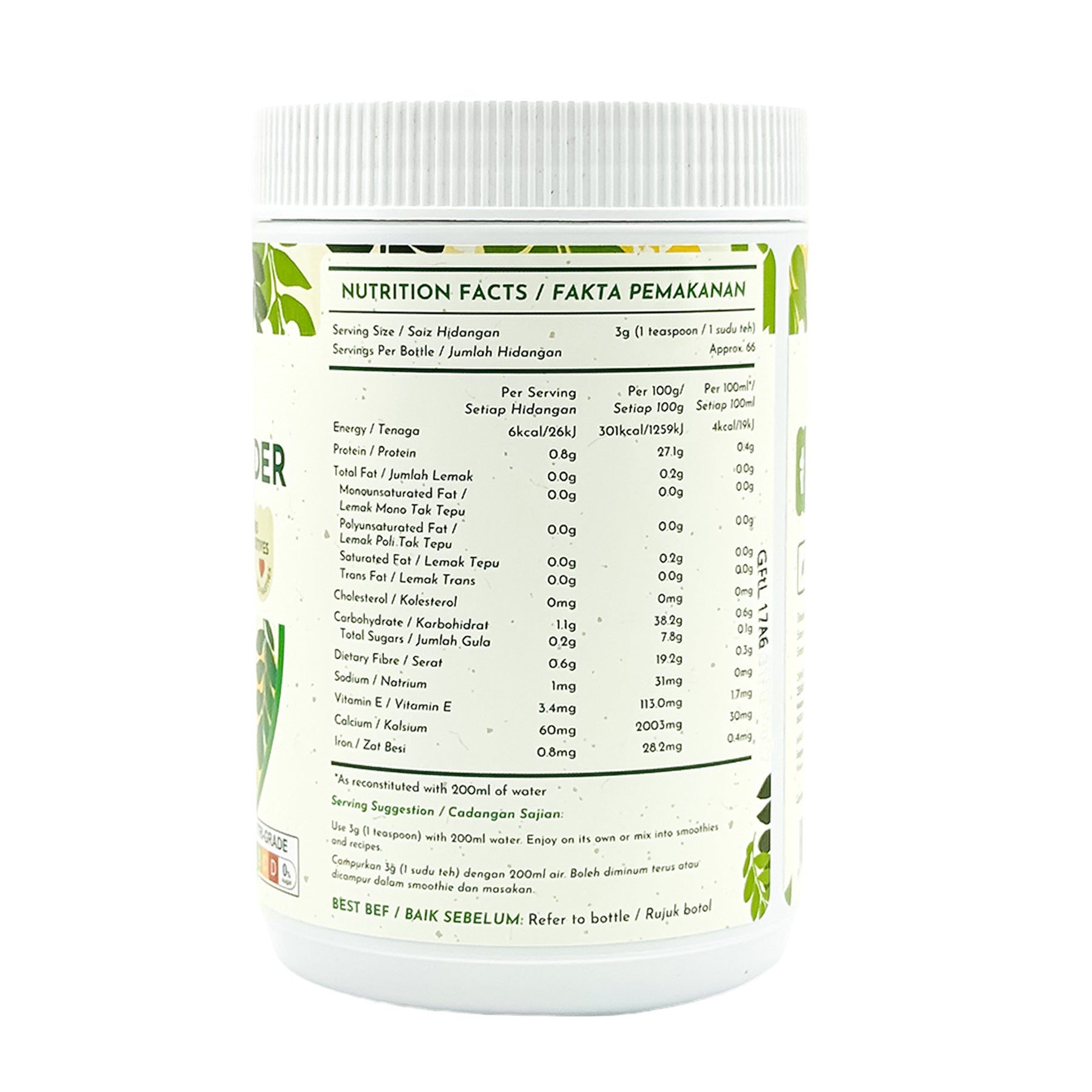 Organic Moringa Powder is packed with essential vitamins and minerals to support overall wellness. It is high in calcium and iron to strengthen bones and maintain healthy blood, and rich in Vitamin E to protect body fats from oxidation while keeping skin healthy. Naturally containing antibacterial, antifungal, and antiviral compounds, it also helps support skin protection. This versatile powder can be easily added to smoothies, juices, baked goods, gravies, or any recipe for a nutrient-rich boost.